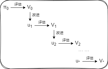 如果将此过程持续下去,那么就会达到策略不再因贪婪化而变更的一个点。此时的策略就是最优策略。这种重复评估和改进的算法叫作策略迭代法(policy iteration)。